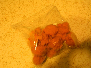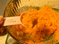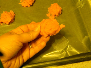 I then scooped out, by tablespoonfuls, the potatoes onto a wax paper-lined cookie sheet. Each tablespoon holds about 1/2 ounce.