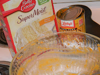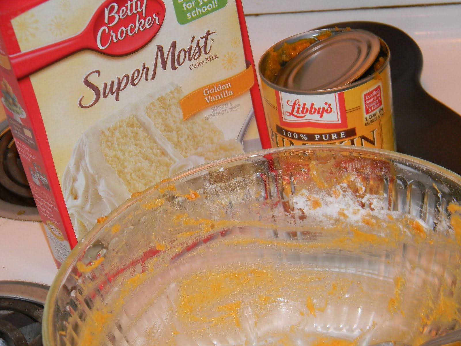 Yup, that's all...just one box cake mix and one can of pumpkin. You just mix the two together and scoop it into your muffin pan and bake at the recommended temperature on the cake mix box. you are not limited to the white cake as shown. In M.O.M.S. Group we were treated to some that had been made with a devil's food mix and some that had been made with a spice cake mix. They were both delicious.