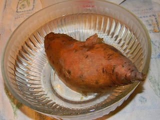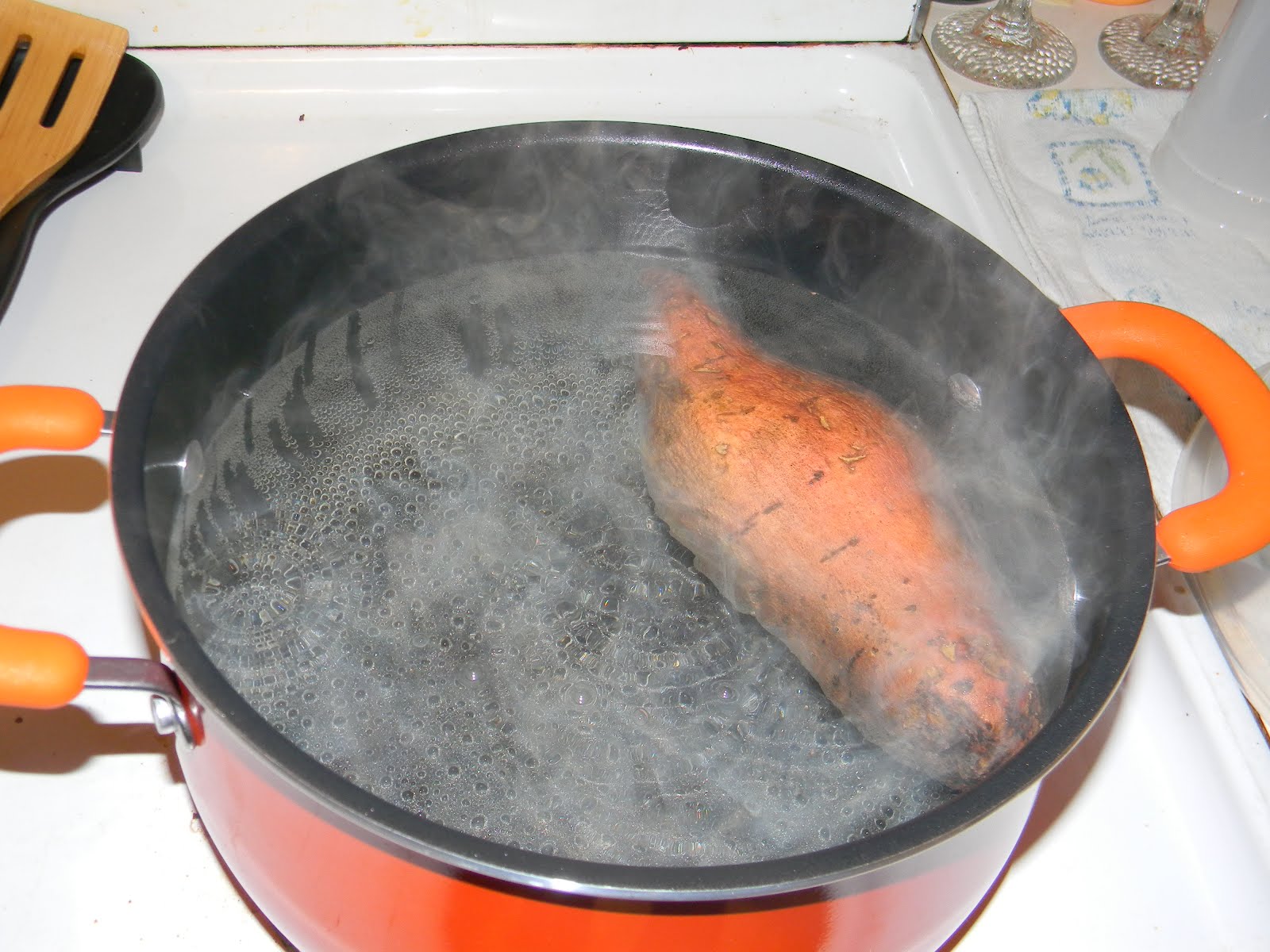 So the first thing I did after giving me sweet potato a good rinse was to boil it for about 20 minutes. It may take a little longer depending on how big the potato is. A good test is to stick a fork in it to see if it's tender.