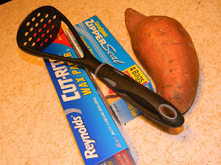Bentley is my youngest of five children. For my older four I always just took the easy way and bought them baby food in the jar. Just a little FYI about jarred baby food...it is mostly water. Yes it's more convenient, but you are only paying for half of what the label says. In these tough economic times I need to make sure I get ALL of my money's worth. Bentley just turned six months old today, which means my little man will be starting solids. Today I decided to try making my own baby food and sweet potatoes were on the menu today.