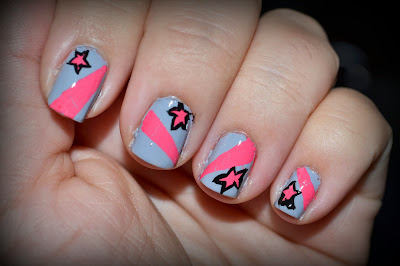 That shouldn't be too hard to recreate something similar, right? Wrong...I guess this is why I am a crocheter, not a nail artist. LOL. Anyhow, this is how they came out...my stars are kind of weird and the grey looks a bit lilac on camera.