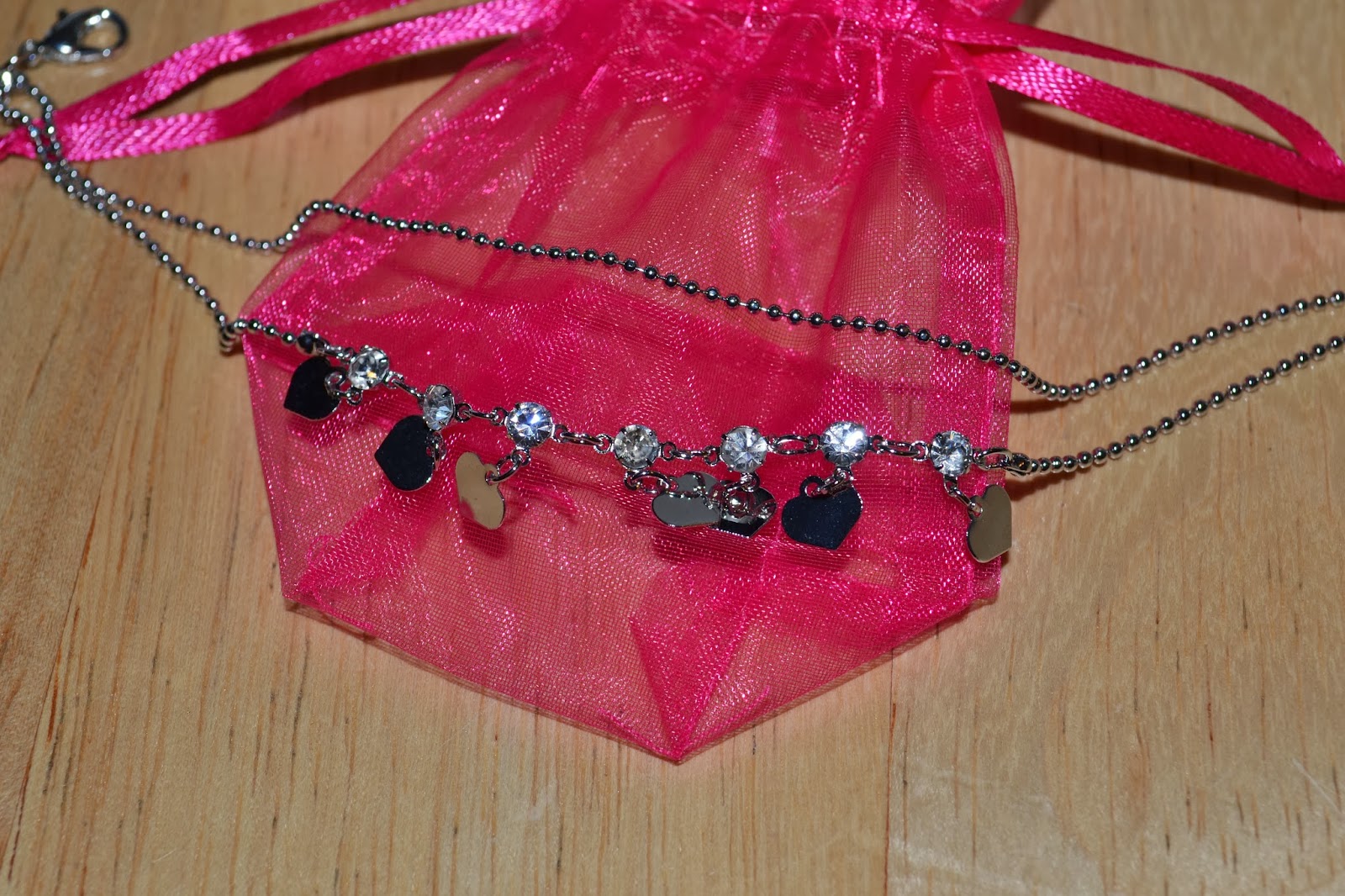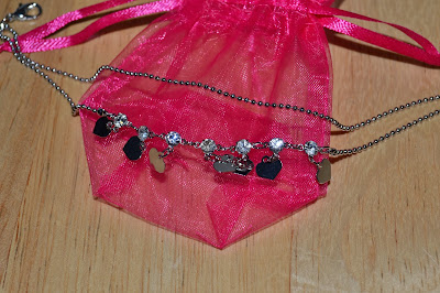 The gift was this little silvertone anklet with tiny heart charms and some rhinestones. It's adjustable so it works well for a bracelet and my 12-year-old quickly claimed this as her own.