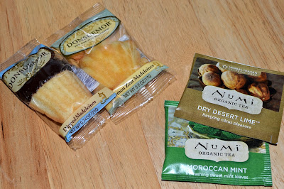 Here are the treats...Donsuemor Madeleines (in Chocolate Dipped and Lemon Zest) and Numi tea (in Moroccan Mint and Dry Desert Lime). The madeleines were delicious and I loved the tea!