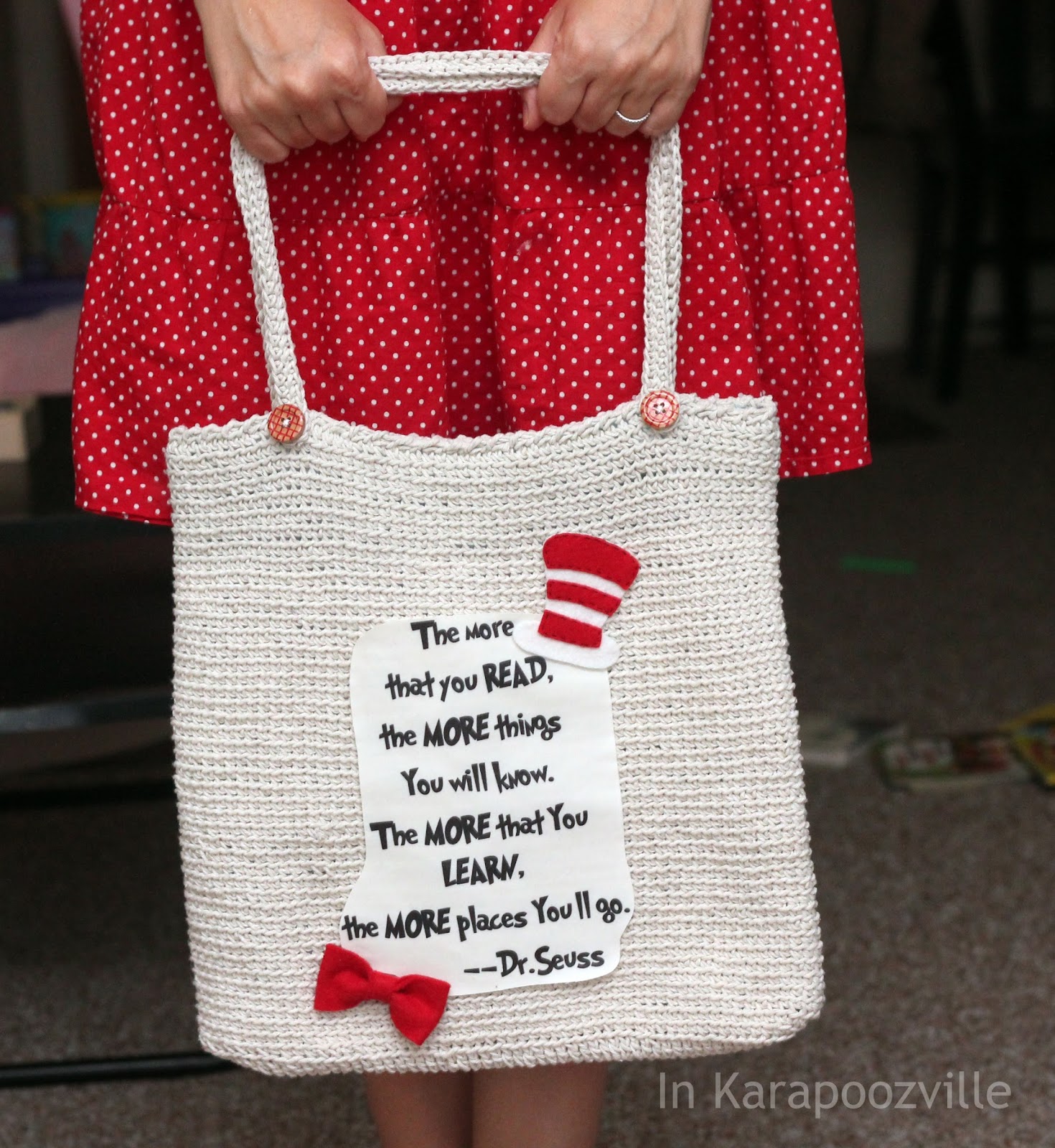 My children LOVE to read and we are all Dr. Seuss fans, so I was super excited when I found this free pattern from In Karapoozville. It's an adorable Library Tote.