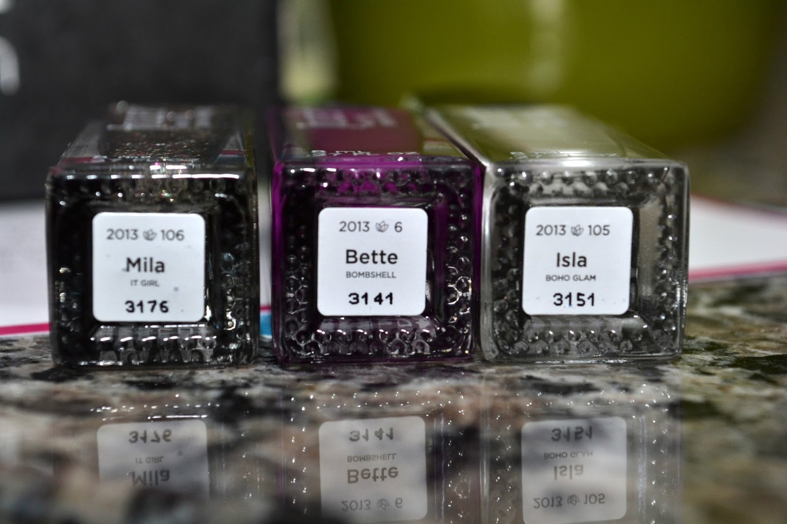 Mila is a really pretty rainbow & silver glitter. Bette is a purple-y orchid creme color. Isla is a pearly white that almost has a bit of silver in it. I love these colors that were picked for me and can't wait to use them.
